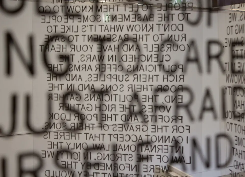 The replacement of the word "class "with" nation " is a comment on the human sacrifices made on the altar of the establishment of national identity. The faces presented are Odysseas Elytis, creator of the poem, and Gianna Angelopoulou Daskalaki, president of the committee "Greece 2021", event manager for the 200 years since the Greek Revolution